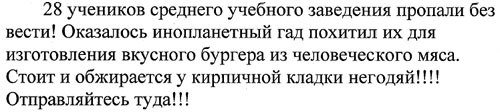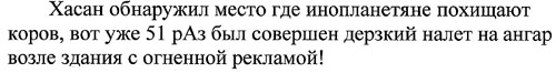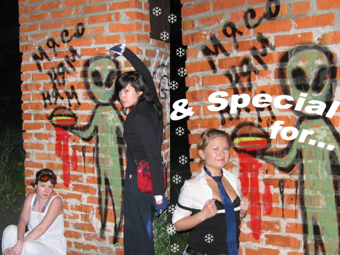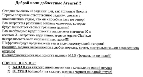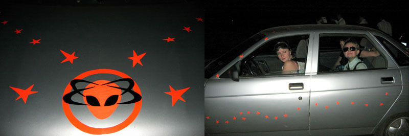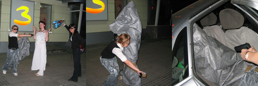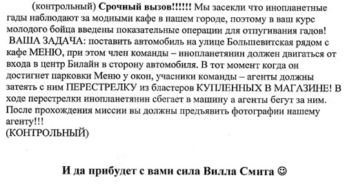 ШтурВУман: «Тааак, едем через Южную дамбу»… Double Ю: «А Может через Северную?» Ш.: – Нет, так короче!... Читаем еще раз задание….и еще раз.. Ну в общем понятно, что мимо заправки до упора, пока станет совсем не пролезть… Едем, мимо заправки, вот стало узко… и еще уже.. Ага, значит правильно едем…и выехали на пустырь… Одна машина уже стоит… Юля(м) снова в машине осталась, ибо страшнейшая головная боль – это вам не Шутки и обезболивающее помогло только на полчаса почему-то…Но решили официально назначить ее Хранителем Тачки! Вот не повезло бедняжке - Душа рвется в бой, а головушка не дает! А мы побежали... И почему-то все налево! Экипажи обеих машин!... Жилой массив, собаки лают…пьянь гуляет…гаражи... Ничего нет…Пьяная компания у бара (не хотели туда идти, честно) – Девчонки! Что ищете?… - Эммм, ну картинку!! – Бу-га-га! Так я картинка! Возьмите меня собой!... А что за картинка?! – Эммм ну инопланетянин (ну не тупо ли звучит…в 3 часа ночи искать картинку с инопланетянином, а?)! – Бу-га-га !! Так это же я! Вы меня нашли!... – О Госпади! Делаем ноги… Опа! еще гаражи!… Идем…Нет, не похоже…Айййй! мусорка-свалка…ийу!.. Тем временем звонит Юля(м), которая помимо Хранителя стала еще и Шпионом по совместительству, отчего ухо её странным образом было высунуто из приоткрытого окна машины, а ушные ультразвуковые волны были настроены на волну разговоров команды соперников: «Тут ребята в другую сторону побежали…» Ну мы к машине…и в противоположную сторону. Ой! А в машине соперников сидят девчонки… - Ну что за кайф сидеть в машине и ждаааать? Скучно! Иначе для чего оно все? Ну да ладна – их проблемы! Ну значит мы бегом в ту сторону, там что-то типа завода. Встретили соперников. Они куда-то налево. Мы решили - на право. Ничего не нашли. Возвращаемся. Пошли за ними… Оп! MIB!