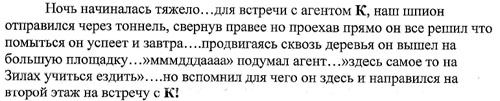 Ладно, сфоткали, вылазим и бегом к машине…ВОДИЛА: «Куда щас?» ШтурВУман: «Надо сначала как-то отсюда выехать!» В.– Так! Тот экипаж поехал туда, и мы попробуем тоже!… Ш. - Нет. Стой. Они возвращаются!... обратно на ту же дорогу давай и к ДКЖ!... Double Ю: «Куда мы едем? Давай те к ВКИУ!» ШтурВуМан: «Нет, сначала на Г. Хасана, иначе крюк получится…больше времени»…Double Ю: «А ВКИУ ближе!» ВОДИЛА (уже подъезжая к ДКЖ): «Так, ёпт!, КУДА!?!» ШтурВуМан: «к Гознаку!» В. – Блин, дальше куда?!?! Ш. - Дальше через рынок на проспект – через площадь на Г.Хасана и там по прямой… – Да. Все. Поняла! Едем!