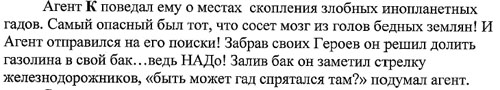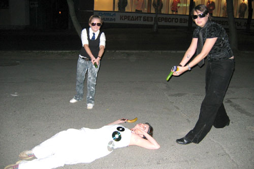 Пока читали ВОДИЛА взбунтовалась: «Ах это они МЕНЯ гадом назвали! Да они еще со мной дело не имели! Пусть спасибо скажут!» …еле успокоили…Приезжаем… Начинаем… Какая-то очень масштабная у нас операция получилась… Неужели это мы там такое устроили перед кафе?… (Потом еще знакомые говорили, что снаружи ночью какие-то придурки носились… - Ой! Упссс… Это не мы, нет…Стыдно как-то стало..) Но делать было нечего – поэтому отрывались по полной. Итак Трое против Одного, точнее против Одной. Жаль, что огурцы не стреляют семечками! Впрочем, у инопланетной живности все равно не было бы шансов! На ум приходили спецэффекты из Матрицы, выполнение которых по понятным причинам было невозможно, а жаль! Ну и после обоюдного Обстрела Инопланетный Гад повержен.. в прямом смысле – лежит на земле и отказывается пошевелиться…Пообещали отдать ей банан…