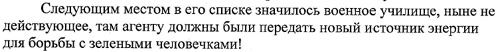 ВОДИЛА: «Ищите Железнодорожников в Желтых бегом!».. Double Ю: «А! ну да!– это у Перми первой!»… так… и Заправка ЛУКойл за ОблГАИ…все ясно… ВОДИЛА: «Ну куда?!» ШтурВУман: «Ай, поехали сначала к железнодорожникам…потом на заправку… а потом будем искать переход, если чо - позвоним ОРГАМ»… В.- Так КУДА?!? Ш. - Так по Ленина до Горького… В. - Это где?! Double Ю - Где трамвай 12 заворачивает.. В. - Ааа поняла!... Ш. - В другую сторону поворот!!!!...В. - Я ж не знала!..... Приезжаем, уже стоит такси… Бежим, Юля(м) попросилась остаться в машине…Видим народ перелазит решетку в сторону Перми 1, но тут замечаем MIB … а Юля(б) уже чуть ли не за ними… Кричим – Юля! Нет! Давай здесь посмотрим сначала!… А она как будто не слышит!!. Чорт!... и так сложилось, что пошли мы по ложному следу – зачем-то залезли на стройку! Пока перелезали через забор, поняли, что пора идти в тренажерный зал… Наша Инопланетянка(ВОДИЛА) запуталась в своем одеянии прямо стоя на этой решетке посреди торчащих прутьев… Чуть было не села на какой-то штырь… (мда, сомнительное удовольствие…), но обошлось. Итак, мы на стройке – на наш взгляд – самое подходящее место! Правда как руки-ноги остались целы - для нас так и будет загадкой! Облазили Ее всю, хоть и было не по себе как-то, Юле (б) сказали спрятаться и осмотреться снаружи… «Господа! Что ищите?!» - это охранник заметил свет от наших фонариков… «Ай! Бежим скорей!»…У нас ничего – у Юли(б) тоже ничего… Тем временем прибежали соперники, сразу в 2 счета нашли… и убежали… Чорт! ЮЛЬКА! Чтоб поменяла фонарь на УФ, и батарейки чтоб свежие были!!!