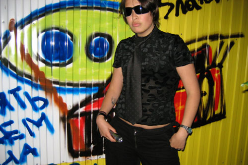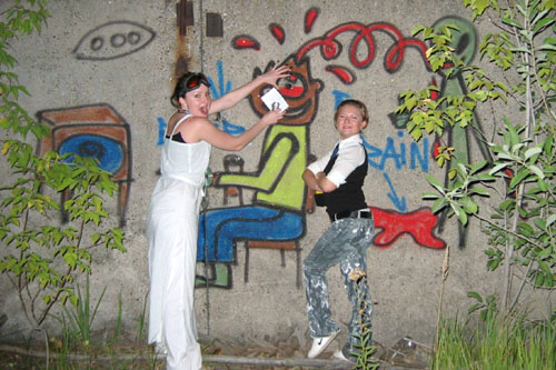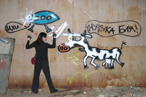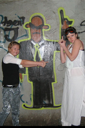ВОДИЛА: «Как едем?» ШтурВУман: «По дороге!.. Хихи….ну.. Б-р Гагарина, Северная дамба, Компрос, Орджоникидзе…и к мосту»!… Подъезжаем, страшно до чертиков! Решаем идти все вчетвером!…Звонок на мобильный Юли(б) – «****?!…Уже на финише!?.. А мы у моста –тоннель ищем… Ага, спасиба…». Смотрим… есть тоннель прямой весь в граффити весь... Юля(б): «Нет, сказали изогнутый…» Чорт! Там еще страшнее! Ладно идем тихо (в смысле медленно) еще и поезд мимо… Грохот неимоверный… Ушатанные парочки навстречу…(спасиба оргам, что в самую глубь его не заставили лезть!!!) ШтурВУман: «ААА! вот он! Он! Да реально Агент J!!!»