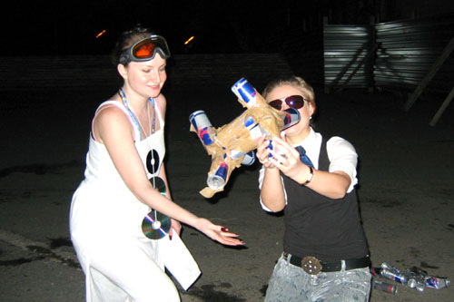 Бегом в машину и к ВКИУ за Рэд Булом!!!Как-то сразу поняли что там будет РэдБулл [PIC-задание] Не знали можно ли проехать у Галереи, поэтому сделали крюк…Приезжаем… Бежим: «О! Здравствуйте Богини РэдБула!» «Здравствуйте Здравствуйте…Вы последние!» «Чорт! Мы последние! Крута!!!» Дают задание.. надо сделать из 9ти банок космический корабль… кричим ВОДИЛЕ «Скотч нужен!» и так пока доставали скотч ШтурВуман с Юлькой (м) набросали, что делать из банок и понеслась… Юлька (б) разматывает скотч, Олеська режет – мы клеим!! ЙЙЙЙЙЙЕС! Готово… Попытались сфоткать в полете – вот что получилось…
